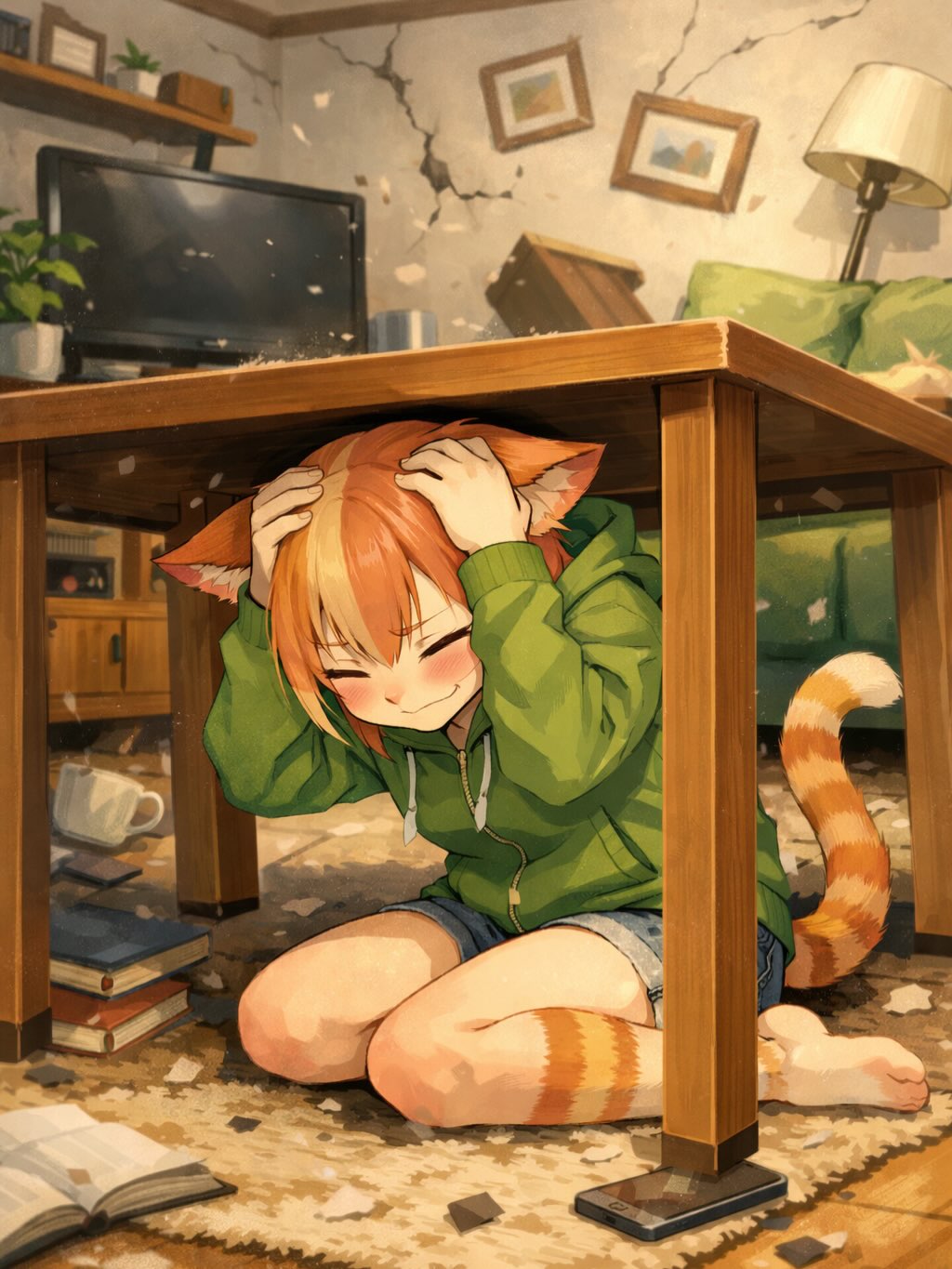 机の下に入り頭を抱えましょう!と